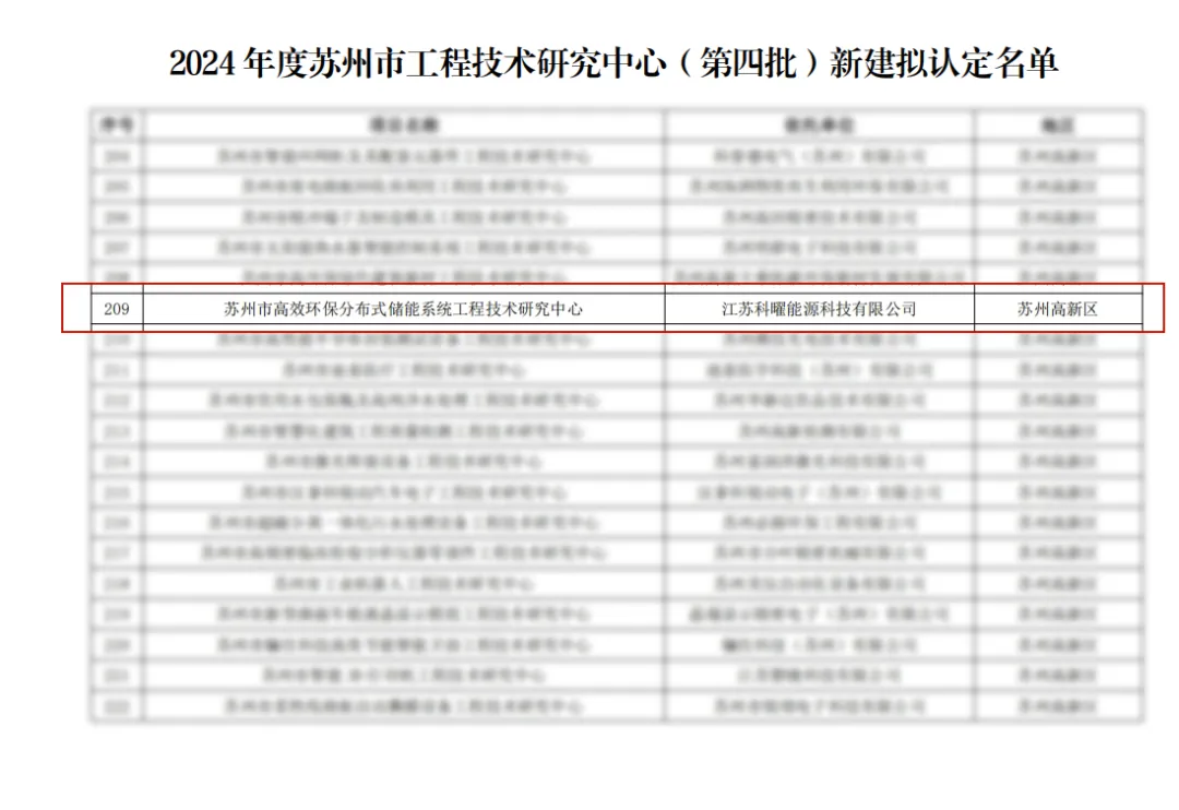 The list of newly-built Suzhou Engineering Technology Research Centers (fourth batch) to be approved in 2024 has been announced. Jiangsu Koyoe Energy Technology Co., Ltd. has been approved by the Suzhou Science and Technology Bureau and has been established as the "Suzhou High-efficiency and Environmentally Friendly Distributed Energy Storage System Engineering Technology Research Center".